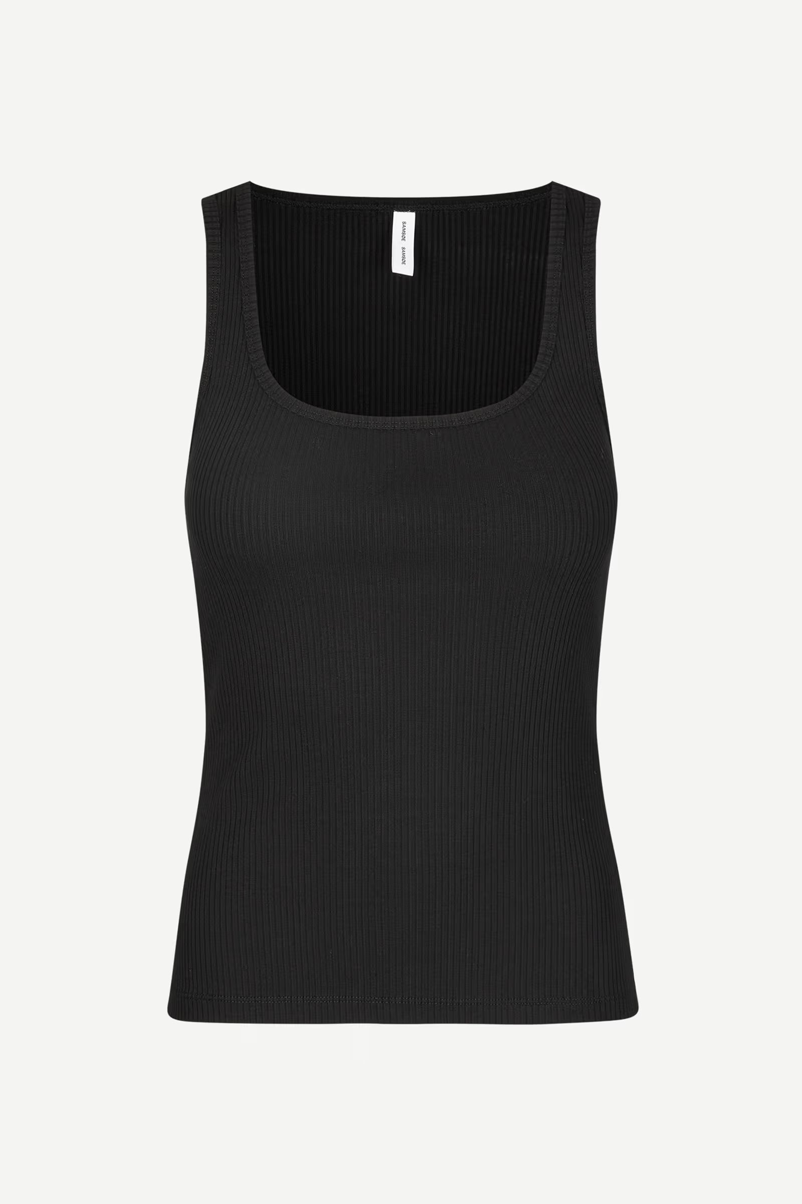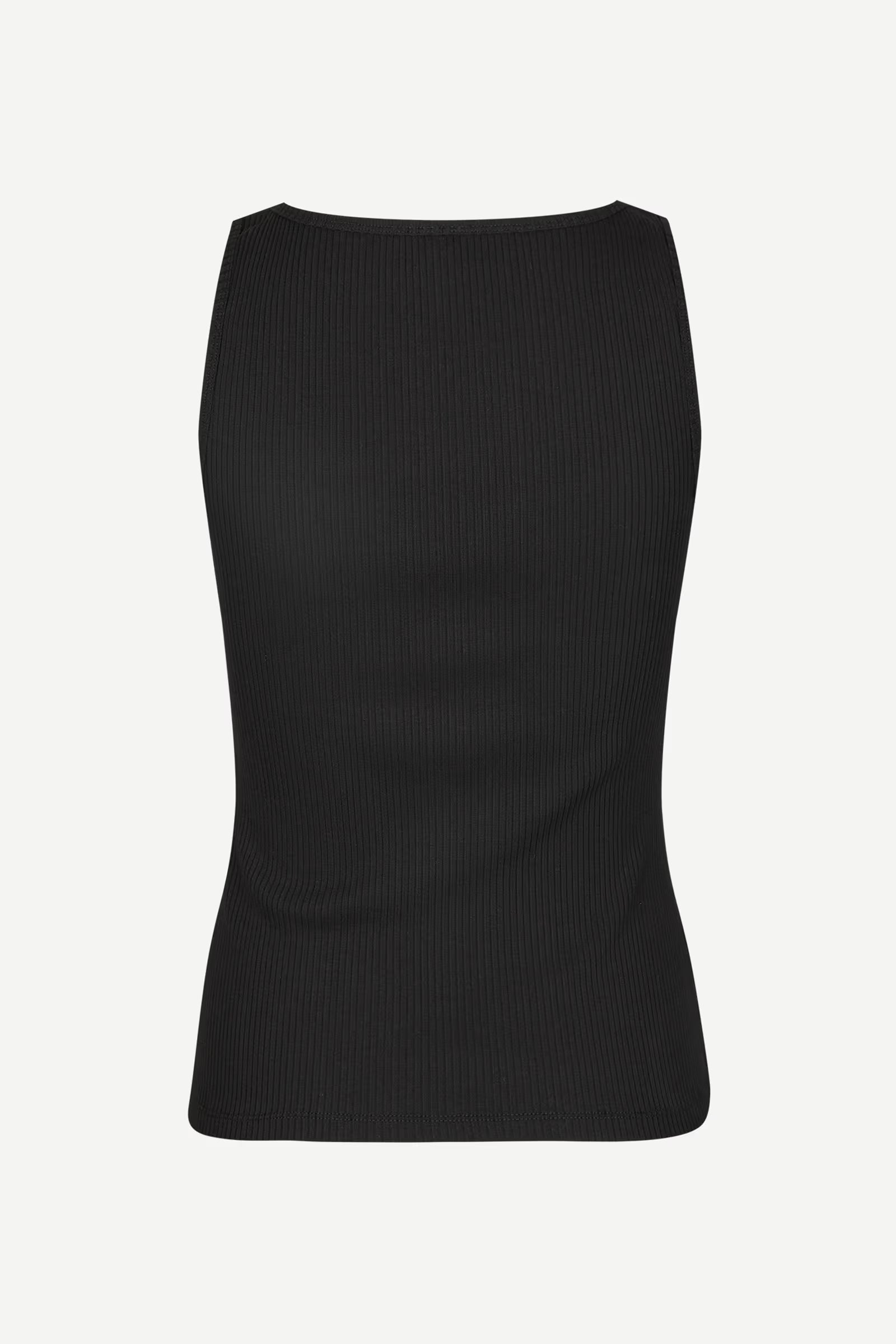 Un débardeur slim en jersey côtelé pour femme, avec une coupe ajustée et un décolleté bateau plongeant à l’avant, relevé par un col montant discret à l’arrière. Une silhouette sobre et contemporaine, parfaite en layering ou portée seule pour un look minimaliste.