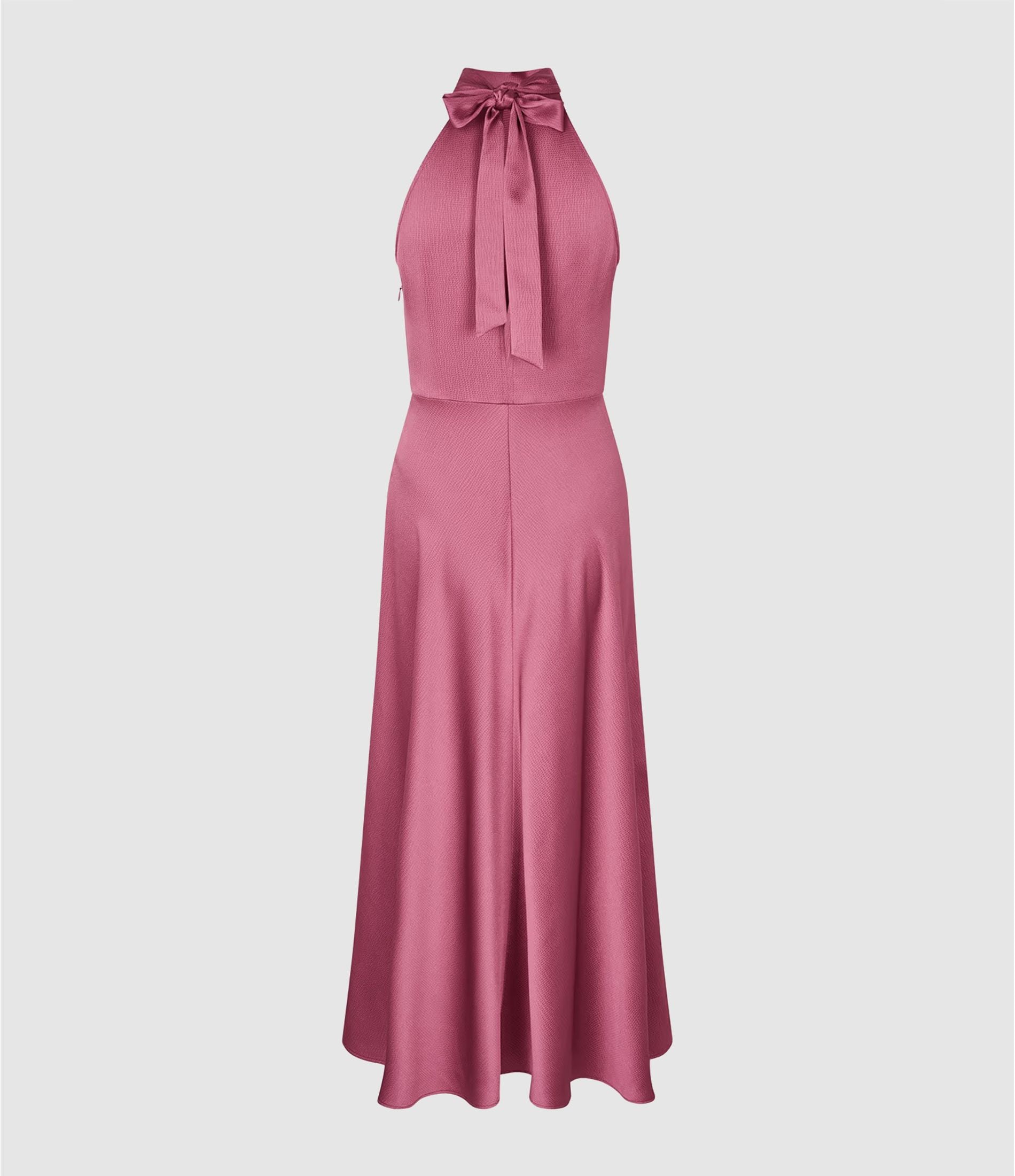 La Rheo Dress est une robe midi sans manches en satin fluide, à la coupe regular fit et à la jupe évasée. Elle se noue dans le dos pour structurer la taille et s’ouvre légèrement à l’arrière pour plus de liberté de mouvement. Très féminine et raffinée, elle allie élégance et engagement durable.