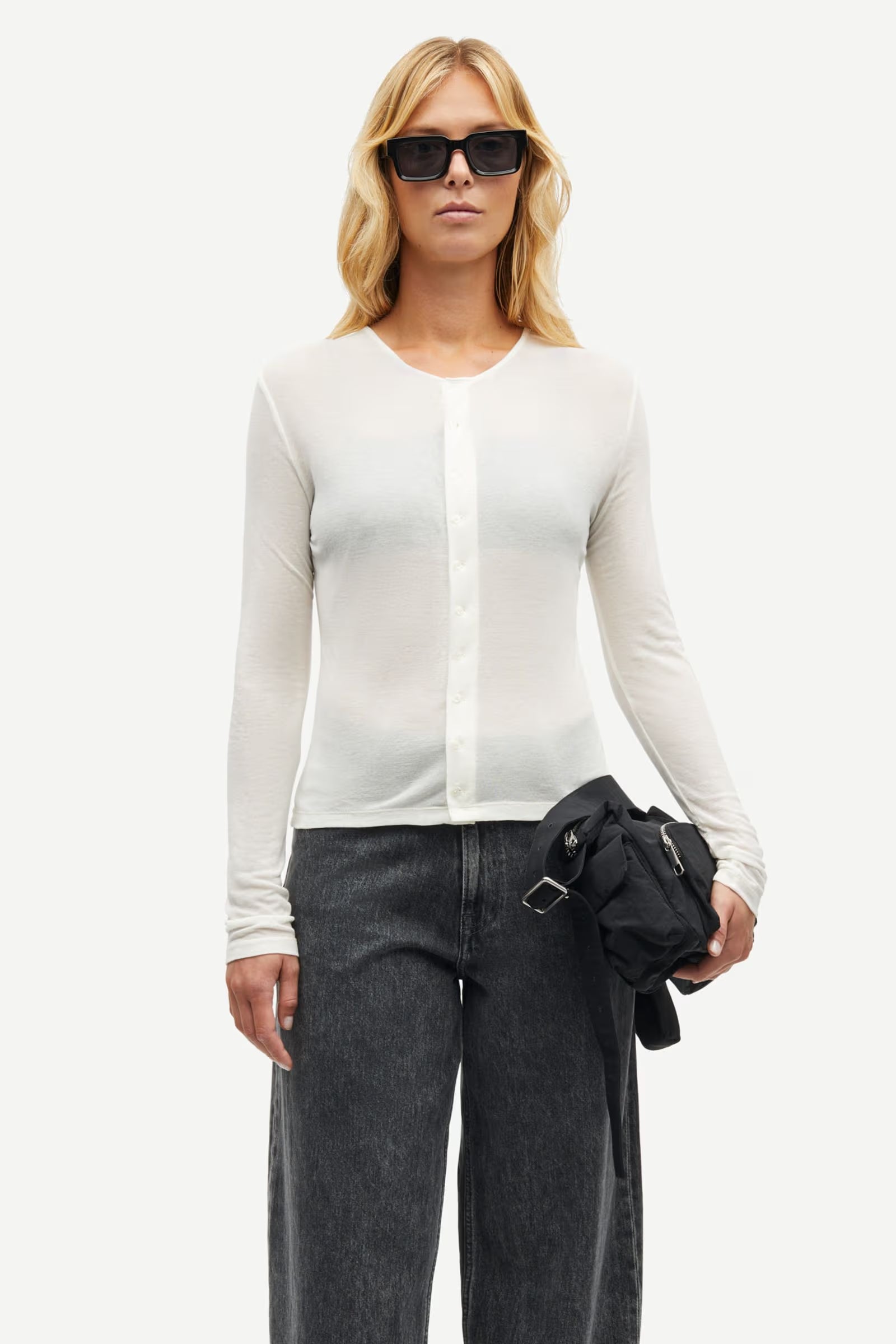 Le modèle Saamber Blouse est un haut à manches longues au col ras-du-cou, à la coupe regular. Avec sa patte de boutonnage sur le devant et sa maille transparente finement tricotée, elle allie une allure délicate à un esprit minimaliste élégant.
