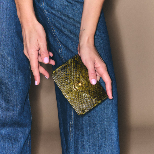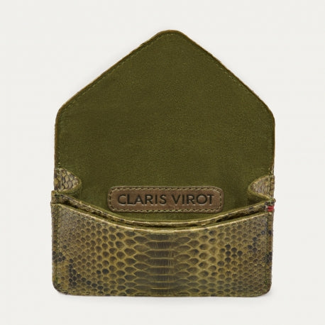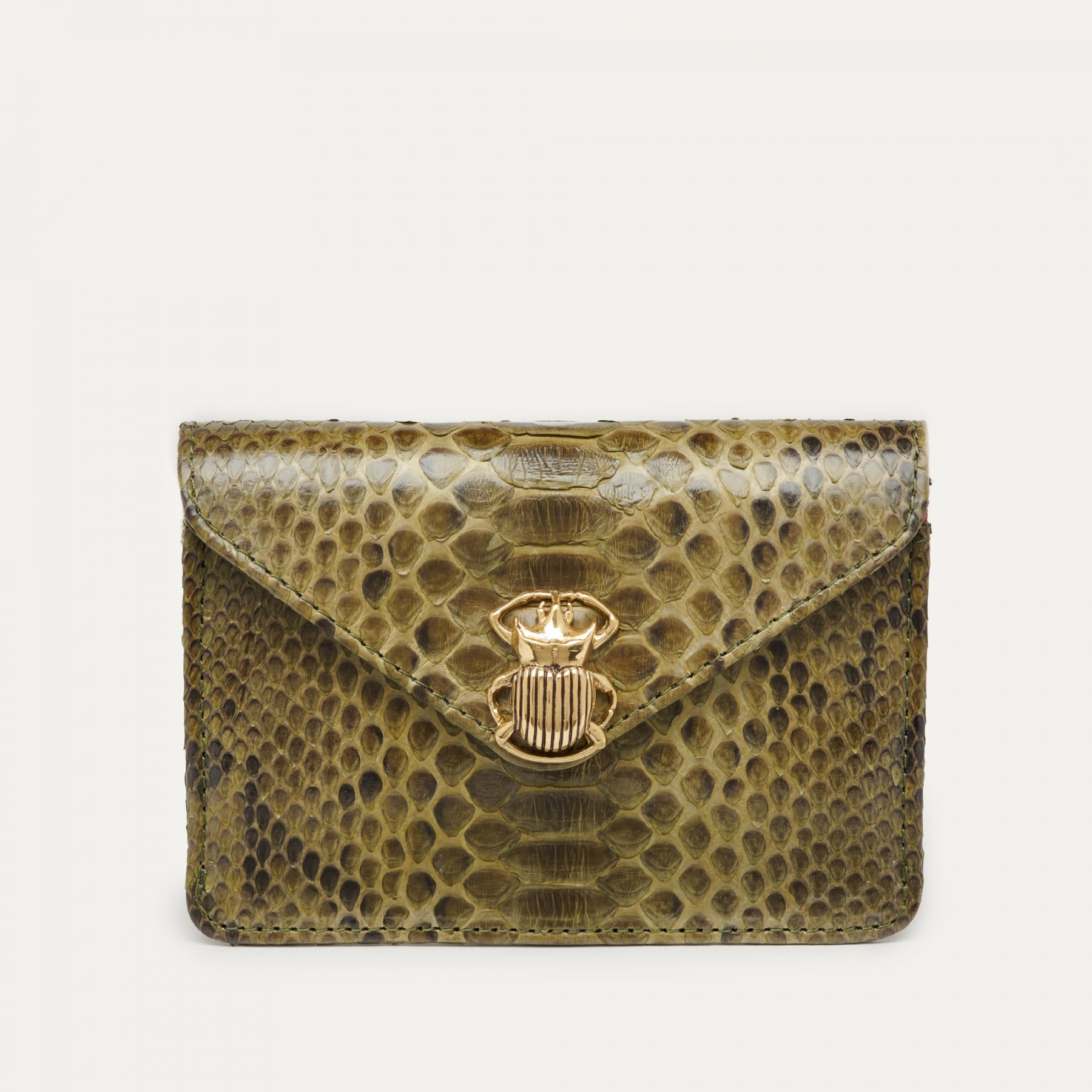 Cette petite pochette en python, prenant la forme d'une enveloppe, est ornée d’un fermoir en forme de scarabée en laiton. Parfaite pour garder tous vos petits papiers et votre monnaie grâce à ses différents compartiments, elle se glissera facilement dans tous vos sacs.