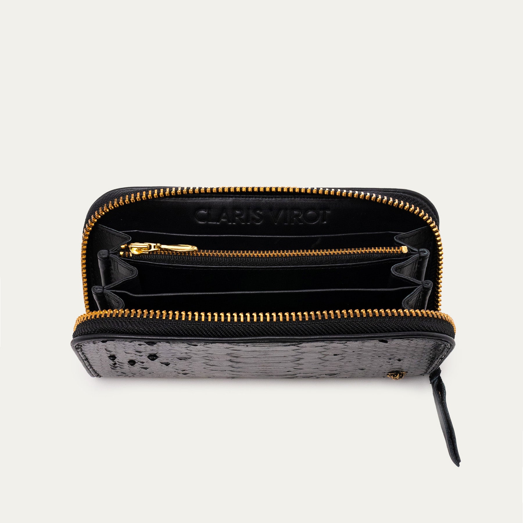 Compact, sophistiqué et raffiné, le Mini Bob Wallet associe le prestige du cuir de python noir à un design ingénieux. Fermé par une glissière dorée, il s’ouvre sur un intérieur organisé avec deux compartiments pour cartes et billets et une poche centrale zippée pour la monnaie. Une pièce de maroquinerie élégante, subtilement tactile, pensée pour accompagner ton quotidien avec légèreté et style. Claris Virot signe ici un accessoire qui allie savoir-faire artisanal et élégance contemporaine.