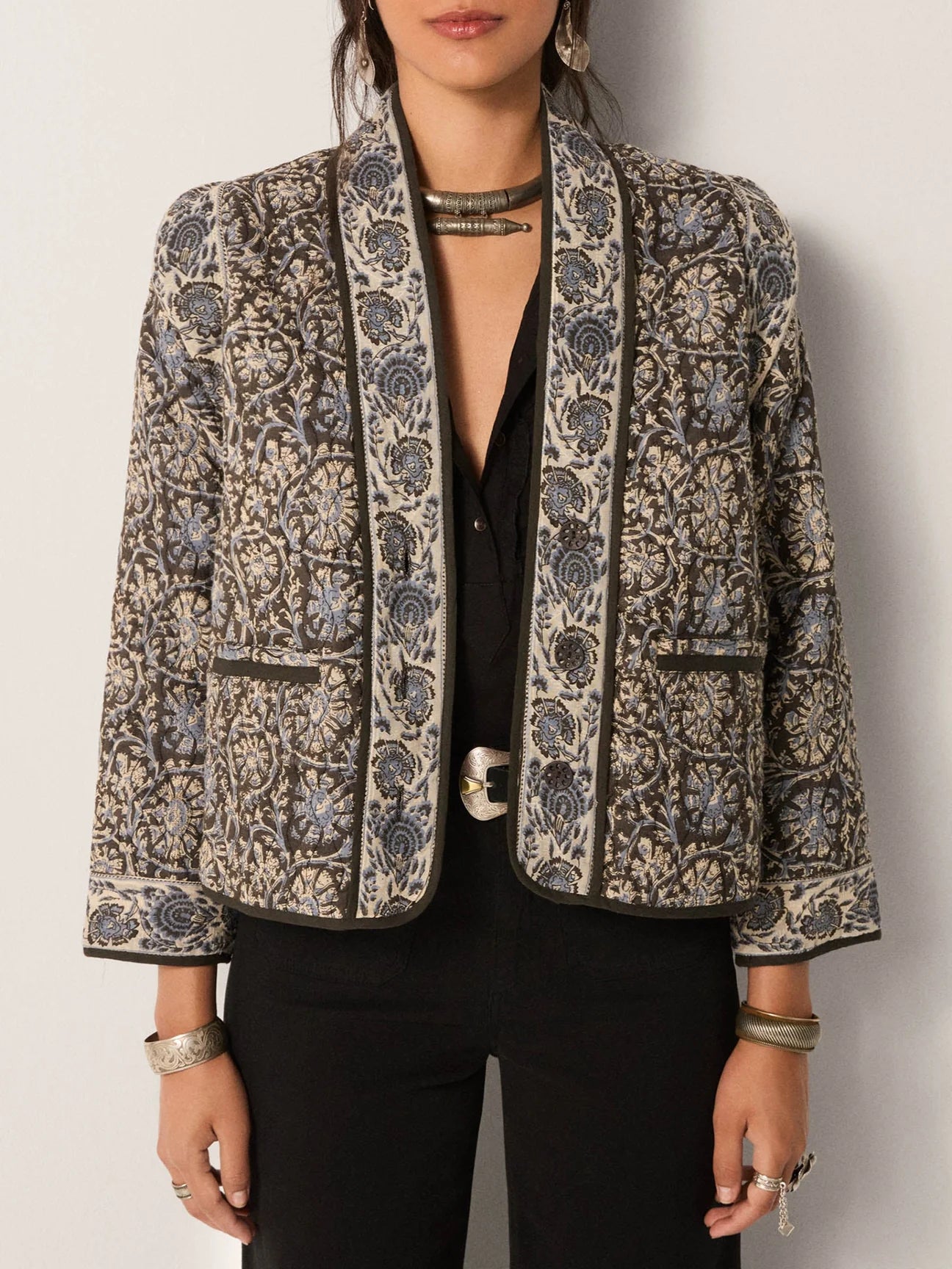 La veste Sugata mêle subtilement légèreté structurée et élégance douce. Confectionnée en coton dobby texturé mais souple au toucher, elle est matelassée avec finesse pour apporter de la tenue sans rigidité. Son coloris Blue Orchid, à mi-chemin entre le pastel et le bleu-gris, évoque une atmosphère délicate et retenue, comme un ciel tendu avant l’orage.