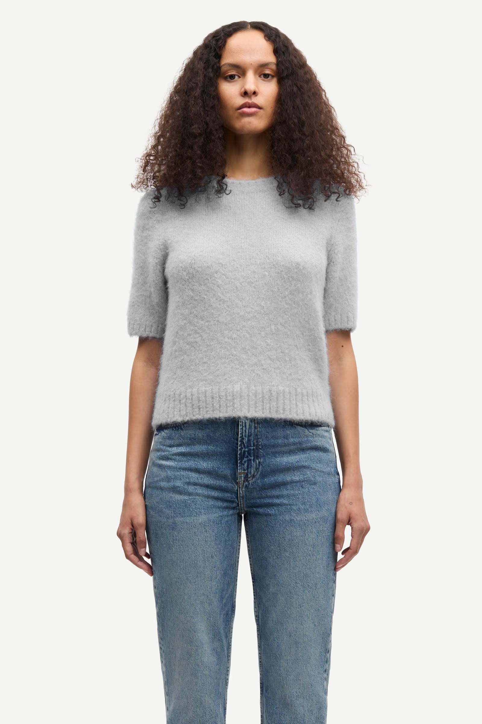 Le Sajeanne Top 15425 en Light Grey Mel incarne l'élégance décontractée à l'état pur. Sa coupe regular et sa silhouette cropped offrent une silhouette moderne et flatteuse. Le col rond côtelé, les manches courtes et l'ourlet côtelé ajoutent une touche de raffinement, tandis que son aspect brossé confère une sensation de douceur. Confectionné dans un mélange élastique incluant de la laine d'alpaga, il assure un confort optimal tout au long de la journée.