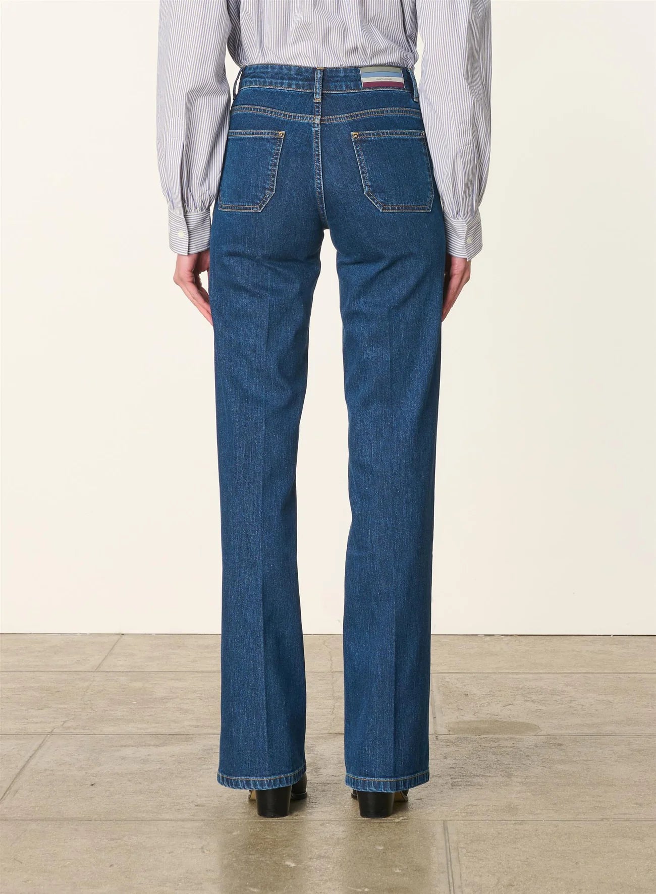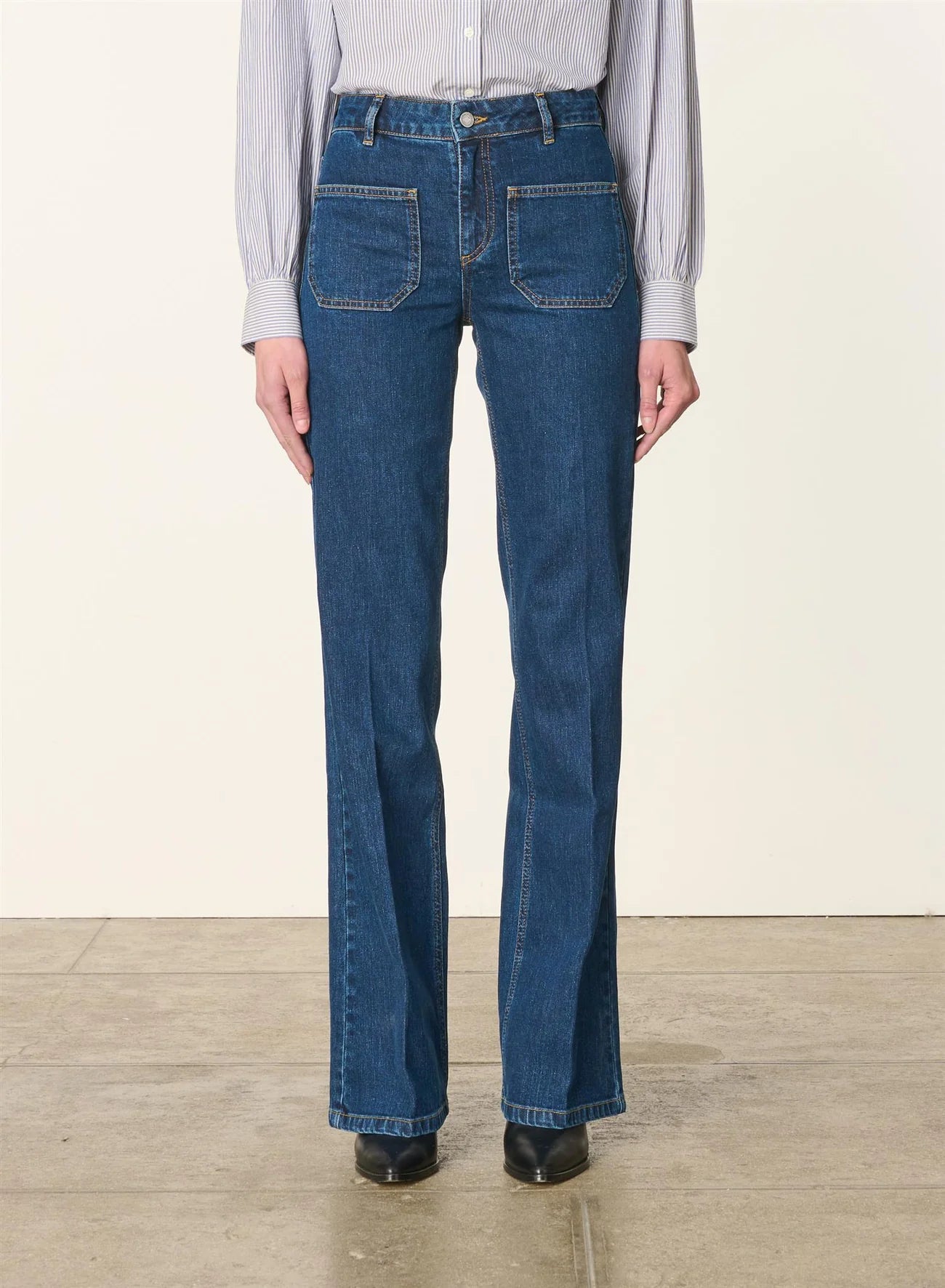 cône de la maison Vanessa Bruno depuis plusieurs années, le jean Dompay se démarque par son flair 70's. Avec sa taille haute et sa coupe flare, il se distingue par ses petites poches plaquées à l’avant et ses surpiqûres contrastantes. Portez-le avec une chemise masculine ou une blouse aérienne pour un look chic et décontracté.