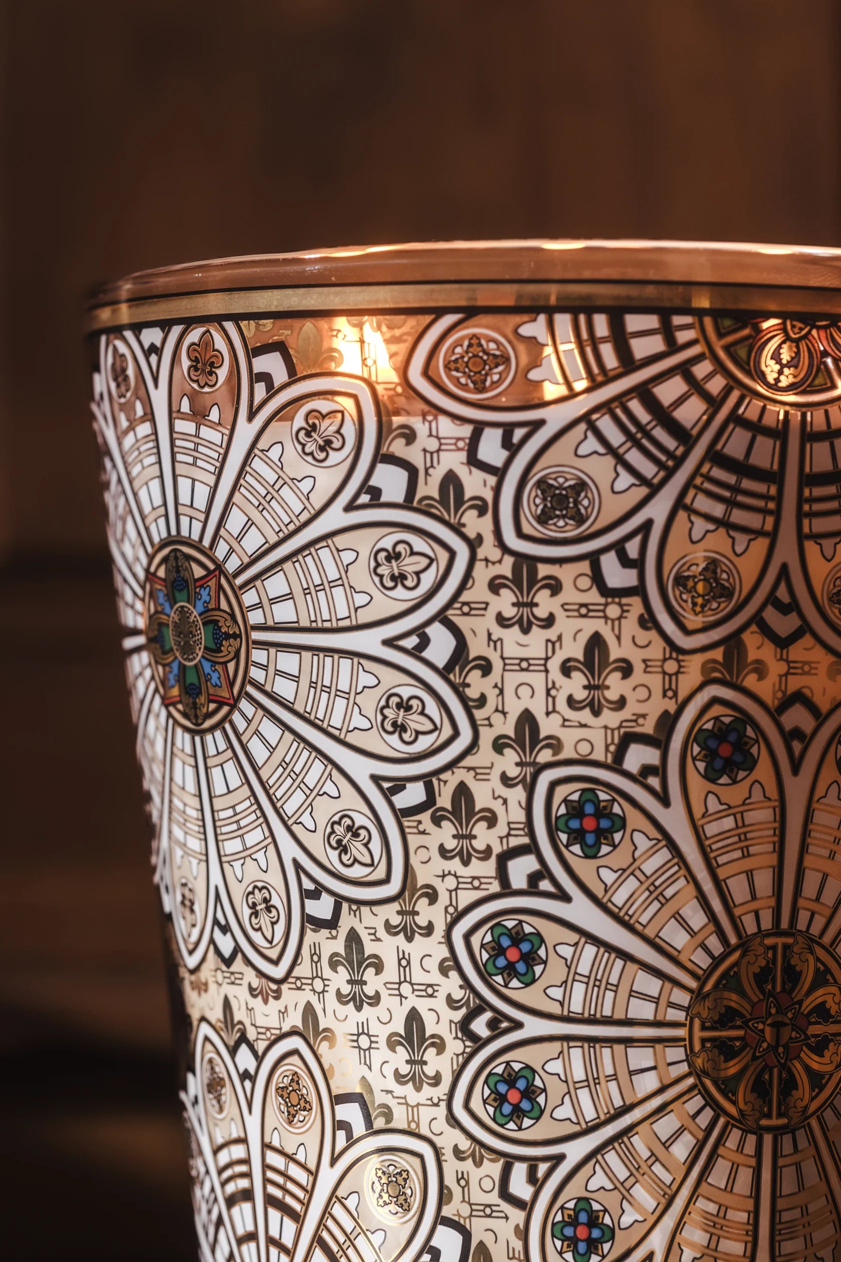 La bougie parfumée Rosace rend hommage à l’architecture gothique et à la lumière des cathédrales. Son verre est décoré d’une sérigraphie précieuse, mêlant or et motifs inspirés des rosaces médiévales. À l’allumage, la flamme révèle un jeu lumineux rappelant un vitrail chauffé par un soleil d’hiver.