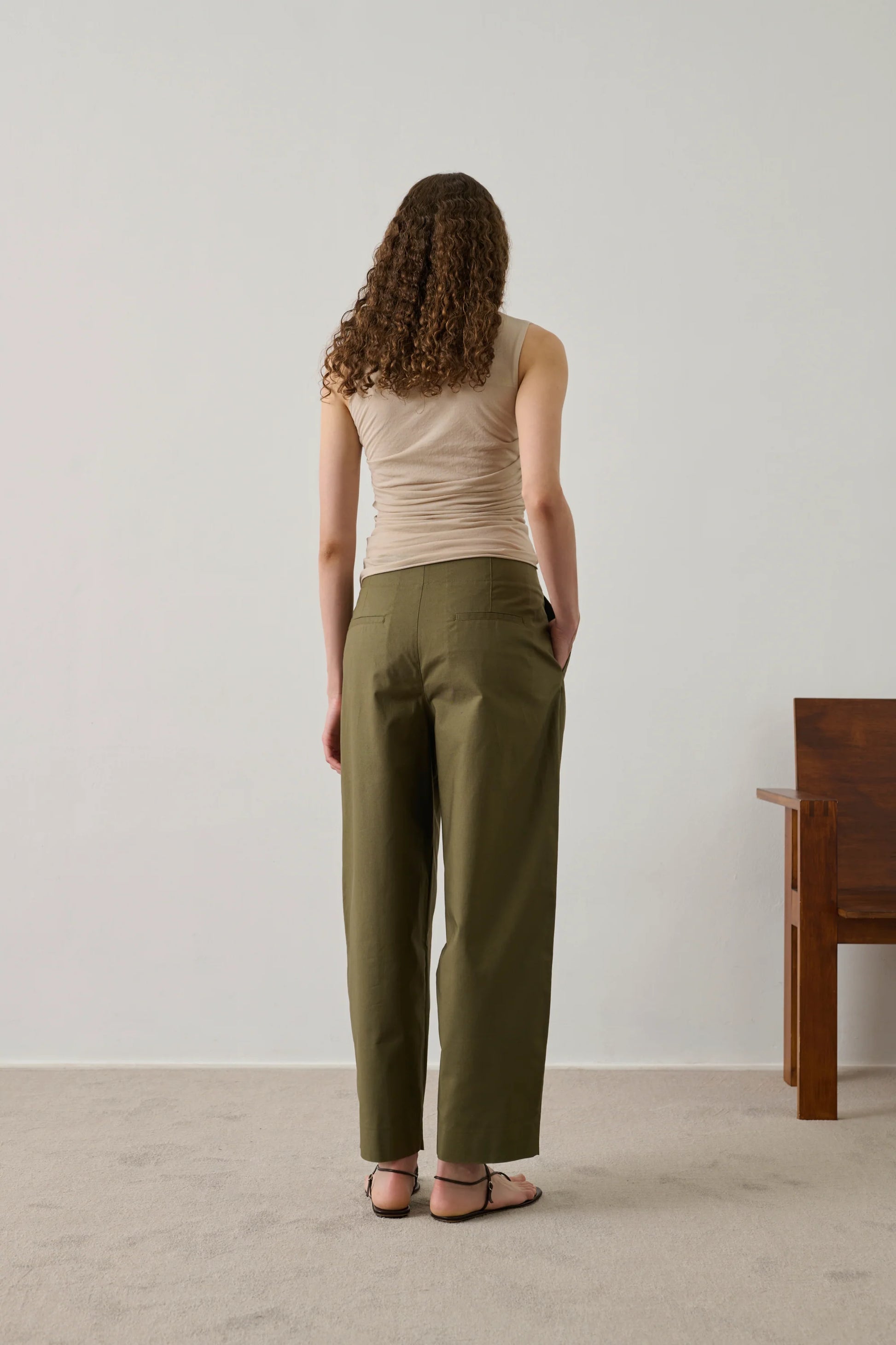 Son volume légèrement arrondi apporte une silhouette contemporaine, tandis que les pinces et le pli marqué le long de la jambe structurent l’allure avec élégance. Les poches italiennes à l’avant et les poches passepoilées au dos complètent ce modèle au style à la fois minimaliste et raffiné.