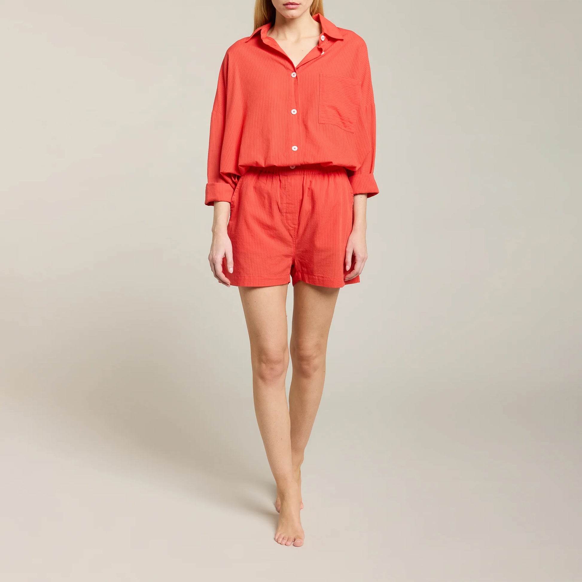 Ses rayures ton sur ton apportent une touche discrète de texture, tandis que l’ourlet cousu et la fermeture à boutons cachés complètent son design minimaliste.